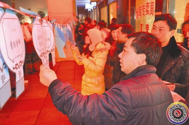 2月6日(农历正月十五),一场传统的元宵灯谜晚会在新康路举行。高高挂起的灯笼,流光溢彩,交相辉映。“灯”街之下人头攒动,前来闹元宵的人们成群结队,逛灯展,猜灯谜。据了解,此次活动由县图书馆举办,共准备2000条灯谜,包括诗文类、成语类、字谜类、实物类、科技类等,内容涉及文学、历史、地理、旅游、医学等多个领域,奖品为文具用品、历史名著、成语故事、科技书籍及其它小礼物等。图为灯谜活动现场市民竞猜乐在其中。