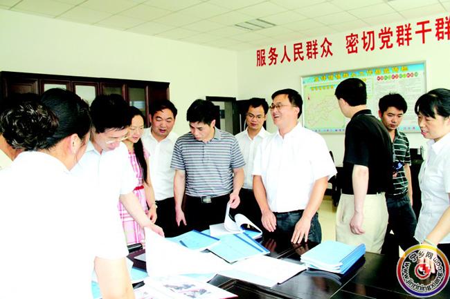 镇党委书记文斌(右四),镇党委副书记、镇长黎国君(右五)和镇人大主席、镇群工部部长李建坤(右七)等陪同上级领导调研镇民情台账制度落实情况