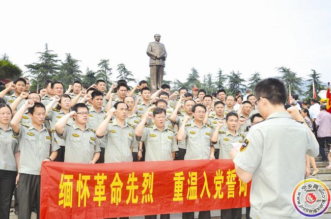 “我志愿加入中国共产党……”7月1日,在韶山毛主席铜像前,县城管局全体党员面对鲜红的党旗,举起右手庄重宣誓。为庆祝党的生日,该局组织新老党员到韶山、花明楼伟人故里等革命教育基地接受传统教育,缅怀革命先烈,重温入党誓词,旨在提升全体党员的光荣感和责任感,进一步推进创先争优活动的深入开展,更好地激发广大党员创先争优的热情,发挥党员的先锋模范作用,为“创建人民满意城市,争当人民满意城管”,实现宁乡城管事业的新发展作出新的贡献。图为该局党员正在庄严宣誓。