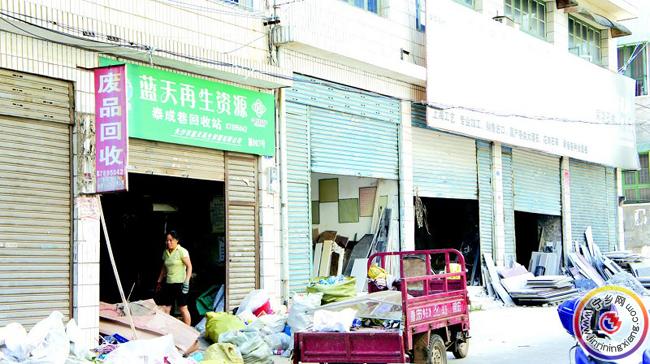 在泰成巷3号,仅邻石材加工店一墙之隔的“蓝天再生资源”的废品收购站,各种废品垃圾或打包成垛,或随意散落在地上,人稍一走近就能闻到一股异味。记者看到,一辆满载旧家电、啤酒瓶等废品的三轮车停在收购站门口,一名40岁左右的中年妇女正在和三轮车主讨价还价。“没有哪个居民区像我们这里有这么多家废品站,仿佛成了废品一条街。”不到200米的小巷就扎堆着3家废品收购站,在杉树巷8号还有一家机油回收作坊。“废品堆在路边,回家都得捂着鼻子,真的无法忍受,每年寒暑假我们一家只得另觅住处,搬回娘家住。”家住杉树巷13号的袁彩霞老师告诉记者,隔壁长期堆着近10堆废品,废品散发的气味臭熏四邻。由于空间有限,经营者们或将收集来的废品从店内一直堆到店门外,或违章搭棚作为仓库,既影响居民出行,又存在火灾隐患。