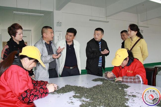 市农发办副主任贺燕(后右一)一行在县农发办主任周向前(后左三)、副主任钟霞峰(后左一)陪同下,调研沩山茶业生产经营情况
