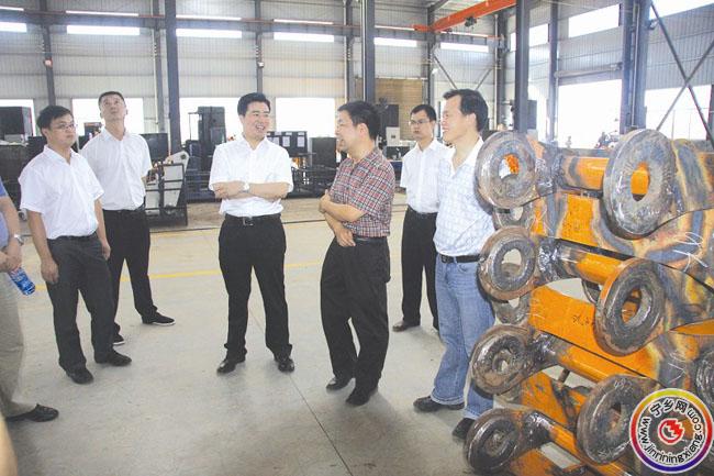 县委书记、县长黎春秋(左三)一行在镇党委书记文斌(左一),镇党委副书记、镇长黎国君(右二)等陪同下现场视察夏铎铺机械工业园企业生产情况