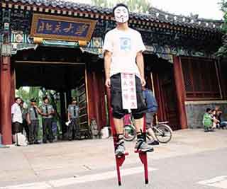 一副高跷,一张面具,一块写着“京生考北大高人一等”的塑料板。日前,90后河南小伙程帅帅靠着这简单的“装备”,在北大门口上演了一场“行为艺术”,表达自己对高考户籍歧视的不满。