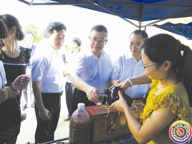 图为黎春秋(前左一)向胡彪(前左二)介绍关山的土特产品