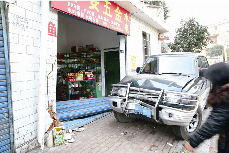 “我当时已睡着,突然听到一声巨响,房子都在晃,不知发生了什么,来不及穿衣服,提着裤子就往外跑,可到前门拉卷闸门时,怎么也拉不开,从后面小门绕出来一看,一台受损严重的越野车正开始倒车……”据“同兴早点”的张先生回忆,当时司机正在准备倒车,张先生立马上前制止,“你们不要动现场,让警察来处理。”听到张先生的话,越野车司机这才停下车。随后,张先生立即通知了一墙之隔的“平安五金水电”的老板唐先生,“房子被撞坏了,快回来。”外出的唐先生接到电话后,立刻赶回店里,也被眼前的一幕惊呆了。门店卷闸门已经掉落在地上,店内槟榔和饮料乱七八糟地撒了一地,墙体裂了一道很宽的口子,门框上的的砖头摇摇欲坠。据唐先生介绍,“我女儿本来在店里玩电脑,电脑就放在卷闸门后的玻璃货柜上,还好把她从店里叫回了家,不然真不知道是什么状况了。”随后,警察赶到了现场进行拍照取证勘察,肇事司机被带走协助调查事故原因。目前,事故原因警方还在调查之中。