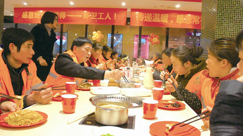“我做环卫工人已经近十年了,从来没有遇到过这样的好事,真是高兴!”56岁的环卫工人谭力华与同桌的几位同事聊着。他说,天下还真有免费的晚餐,让他既感到意外又十分温暖。“第一次在这么豪华的餐厅吃自助餐,这样的盛情,这样的待遇,是我从来不敢想的。”40岁的环卫工人熊燕飞高兴地告诉记者。