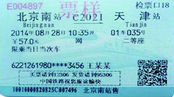 4、部分车票正面将标注“买票请到12306,发货请到95306”字样。