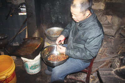 夏秧清把压干的豆腐搬到工作台上,一块块地拆除纱布后,李东强就搬到里面的工作间,坐在一个正在加热的小锅旁,往锅里放了一些食盐后,就将一部分豆腐放进小锅里一边煮,一边拿剪刀剪栀子花果子,将果子剪成两半,放进锅里煮。李东强:“这样的好处是,第一,豆腐里进了盐,有盐味;第二,栀子花果子有药性,能释放出金黄色素,使豆腐颜色变成金黄色,好看!市场上的香干,有的使用的是色素,对身体有害!我们这个工艺是我爷爷传承下来的!”