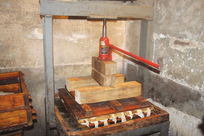 制作香干要经过17道工序,主要是:浸泡、沥干、出浆、做豆腐老、定型、压干、包块、着色、烘干。记者在制作间看到一个木桌上,一个千斤顶顶压着一桌豆腐,清水从豆腐间不停地流出来,李东强说;“这是压干豆腐老里的水,制成豆腐,这样的豆腐,方便包装、细嫩、炒不烂!解放前压豆腐老,是用石磨压,压力小,压不干,不好做香干。现在有了千斤顶,可好了!”