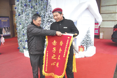 12月13日,在长沙友谊阿波罗商城入口处,宁乡老汉黄洪兵将一面绣有“拾金不昧,赤子之心”的锦旗送到了护卫队员晏星星手中,以感谢他在拾到贵重物品后及时交还的可贵精神。赠送锦旗过程虽然简单,但在寒风冷雨的长沙街头,却如一股暖流感染着众多行人,大家纷纷拿出手机为端着锦旗的两人拍照留影,同时不忘竖起大拇指,为小保安的拾金不昧和老汉的重情知义点赞一番。