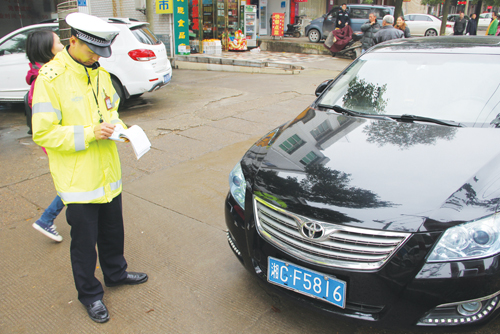 图为宋日红在东沩东路对违规停放车辆进行抄牌处罚。