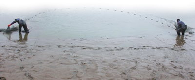 随着池塘里的水越来越少,枯败的竹枝露出了水面。有的池塘不能全部把水放干,还要人工舀水或者用水泵抽水。随着水位的进一步下降,先是露出了青黑的草鱼背,接着是雪白的鲢鱼也露出了水面,最后才是个头较小的鲫鱼、鲤鱼、翘背鱼、黄鸭叫……一条条活蹦乱跳的鱼儿在塘泥里打滚挣扎着。