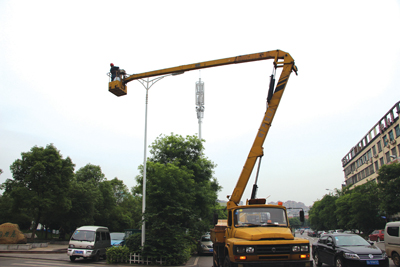 5月18日,记者途经一环路人民医院门口时,只见一台标有“路灯管理”的作业车停在路边,工作人员正在对医院围墙外的路灯进行更换。