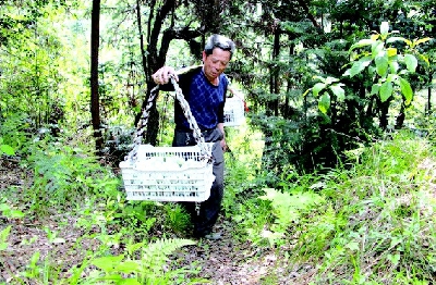 朱合平从林场里挑着鸡蛋赶回家。本报记者 魏枫 摄
