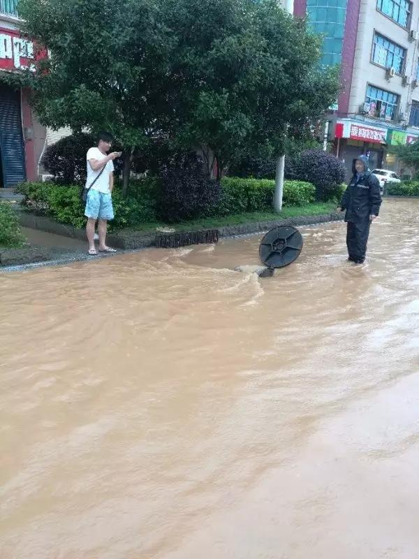 白马大道路段积水严重,水流湍急且浑浊,下水井盖被洪水冲开,白马桥城管队员在冰冷的水中值守近3个小时,直至洪流退去,井盖关上方离开。