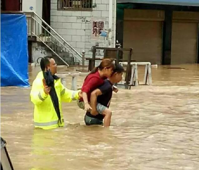 位于体育场旁的启成幼儿园积水严重,最深处将近1米,120名幼儿被困园内,眼看积水将要浸入,城管局紧急调度20余名队员帮助转移幼儿,历时40分钟,将所有幼儿安全转移。