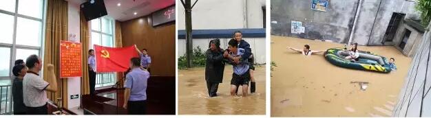 县公安局机关党支部4名预备党员,在党旗下进行入党宣誓后,就马上奔赴抗洪救灾一线,转移受困群众。