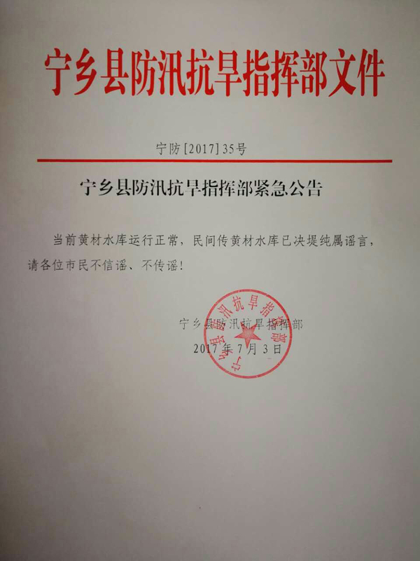 【宁乡县防指】县防指紧急公告:当前黄材水库运行正常,民间传黄材水库已决堤纯属谣言,请各位市民不信谣、不传谣!