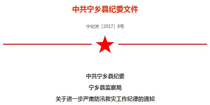 当前我县防汛救灾工作正进入关键时期,为进一步强化全县各级党员干部防汛救灾的政治意识、大局意识、责任意识和纪律规矩意识,坚持以人民为中心,全力做好防汛救灾各项工作,切实保障人民群众生命财产安全,根据《中共长沙市纪委长沙市监察局关于进一步严肃防汛救灾工作纪律的通知》(长纪发〔2017〕5号)文件精神,结合宁乡实际,现就进一步严肃防汛救灾工作纪律通知如下: