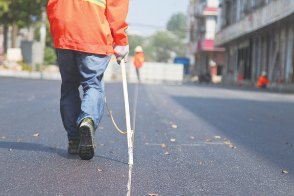 工人在新铺的柏油路面上画线。本报实习记者 张奇涛 摄