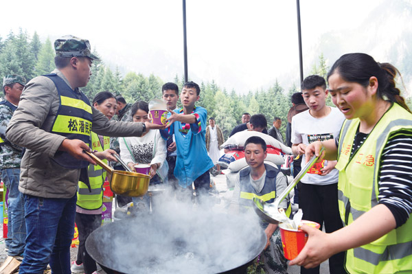 8月9日,在四川省九寨沟县九寨天堂洲际大饭店停车场,救援人员为滞留游客提供食品。 新华社发