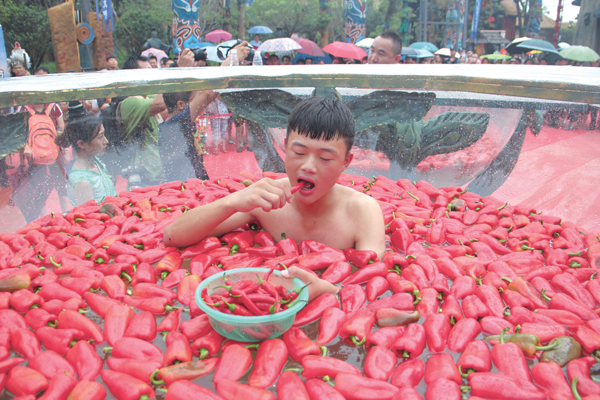 坐在泡着火红辣椒的巨型“酒樽”里比吃辣椒,确实刺激。本报记者 龚再蓉 摄
