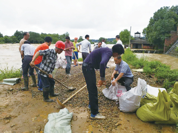 图为回龙铺镇干群在沩江太阳坝段装沙袋。本报记者 孙新明 摄