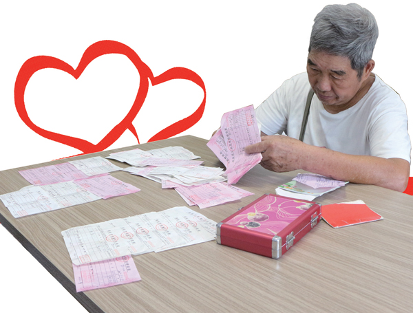 厚厚的捐款凭条展示了老人的片片爱心。本报记者 邬艳 摄