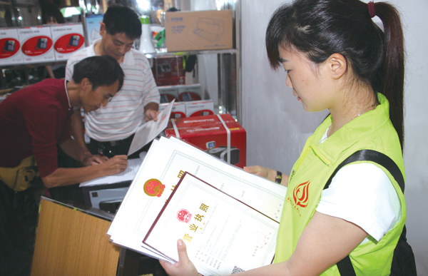宁乡网—今日宁乡讯(文/图 本报实习记者 林佳妮 记者 刘汉光)“老板,营业执照给您补办好了,要贴在哪里?”近日,手捧着补办好的营业执照,沙河市场电子产品经营户黄勇有些不敢相信。他告诉记者,沙河市场部分店面的营业执照被洪水冲走,由于没有营业执照,导致灾后连申请网店也受到了影响,“本来想今天自己去跑一趟把营业执照拿回来的,没想到县市监局特事特办,不仅帮我们补办,还亲自送上门,真感谢他们这种贴心的服务。”