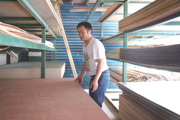 周厚友在清理货架上的板材。