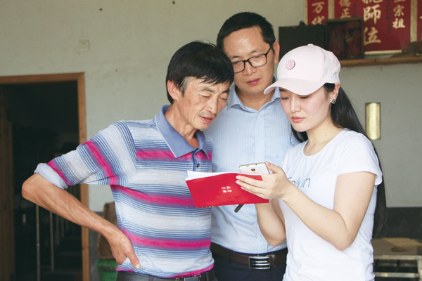邓文慧(中)与结对帮扶干部一起走访贫困户方泽伏(左)。本报记者 范婷 摄
