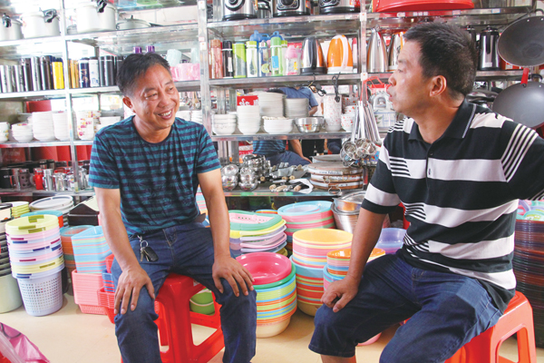 王月明(左)在了解党员经营户刘德华的灾后恢复情况。