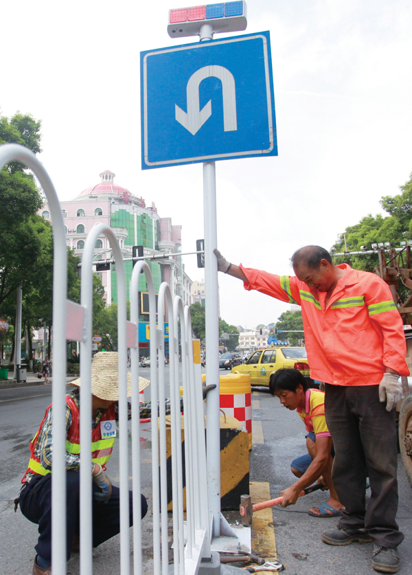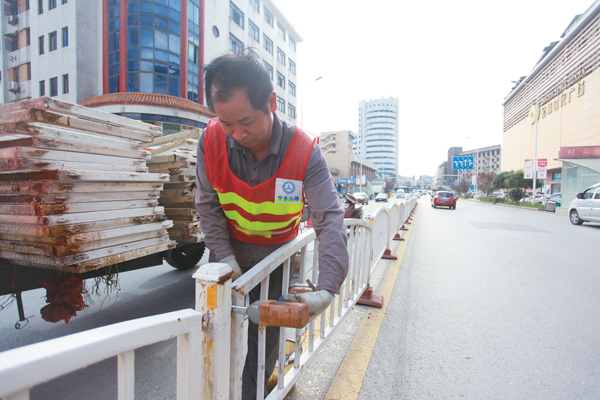 工人正在修复城市马路中的栏杆。