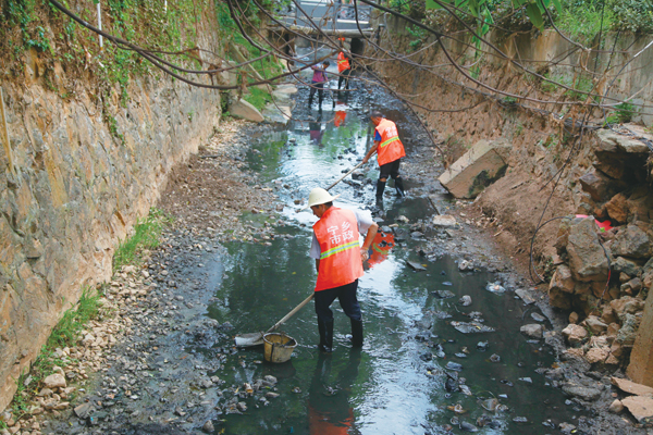 工人在清理化龙溪中的白色垃圾。