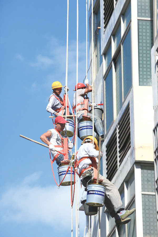 城市美容师不畏酷暑刷外墙。