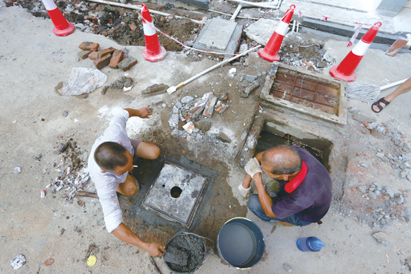 工作人员对井盖进行翻新。