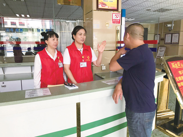 喻秦平(中)和高斌(左一)耐心地为患者解答和指引如何就医。本报通讯员 章雅丽 摄