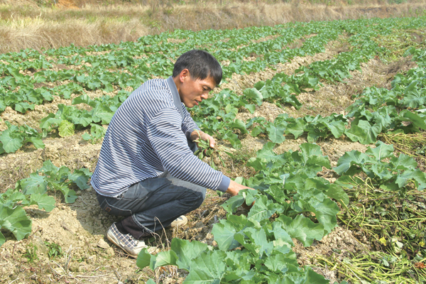 李桂良正在油菜地里忙活。 本报记者 小范婷 摄