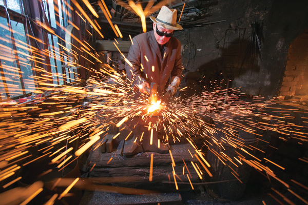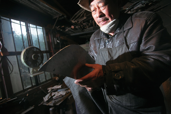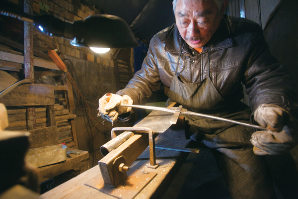 打铁既是一种体力活也是一种技术活。图为丁金华在认真打磨作品。