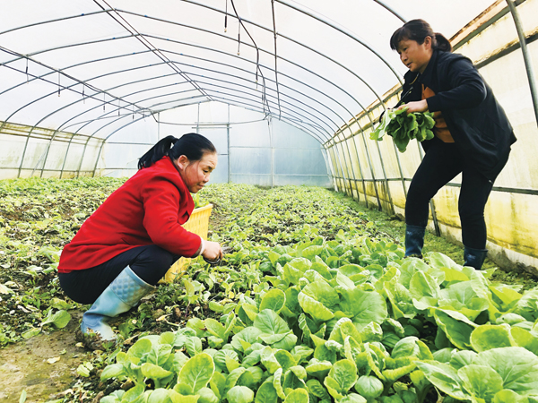 图为湘都工作人员在大棚摘有机蔬菜。