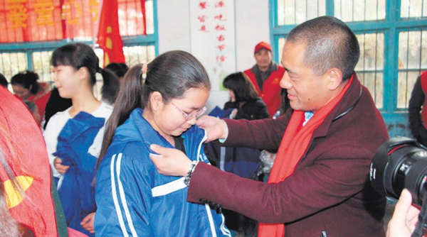近日,宁乡向日葵爱心会会长刘吉兵(右一)和会员们来到龙田镇七里山中学,给该校158名学生每人赠送了一套冬季新校服。 长沙晚报记者 贺文兵 摄