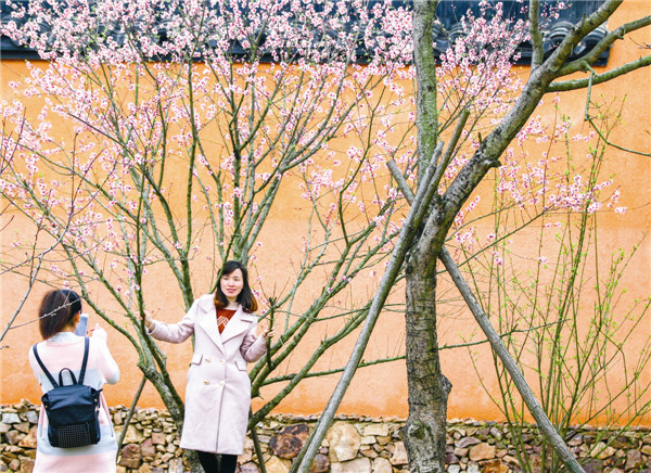 游客在盛开的桃花树下拍照留影。