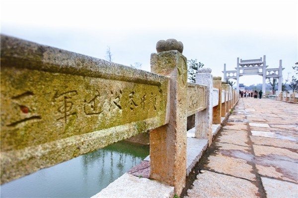 古朴的桥栏上刻着“三军过后尽开颜”的字样。