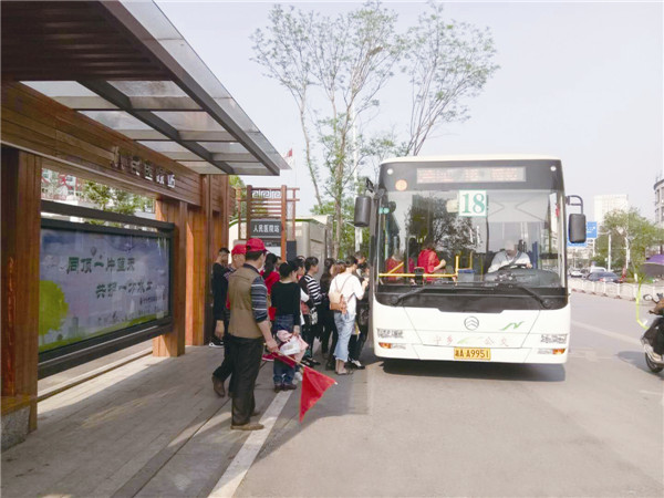 图为市交运局的文明劝导员正在引导市民乘坐公交车。本报记者 刘畅 摄