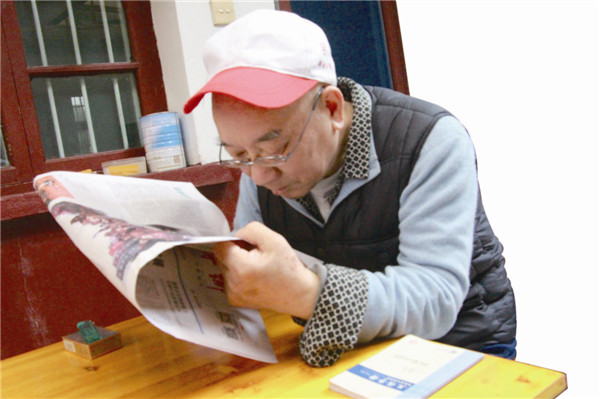 刘勋陶老人正在读报。