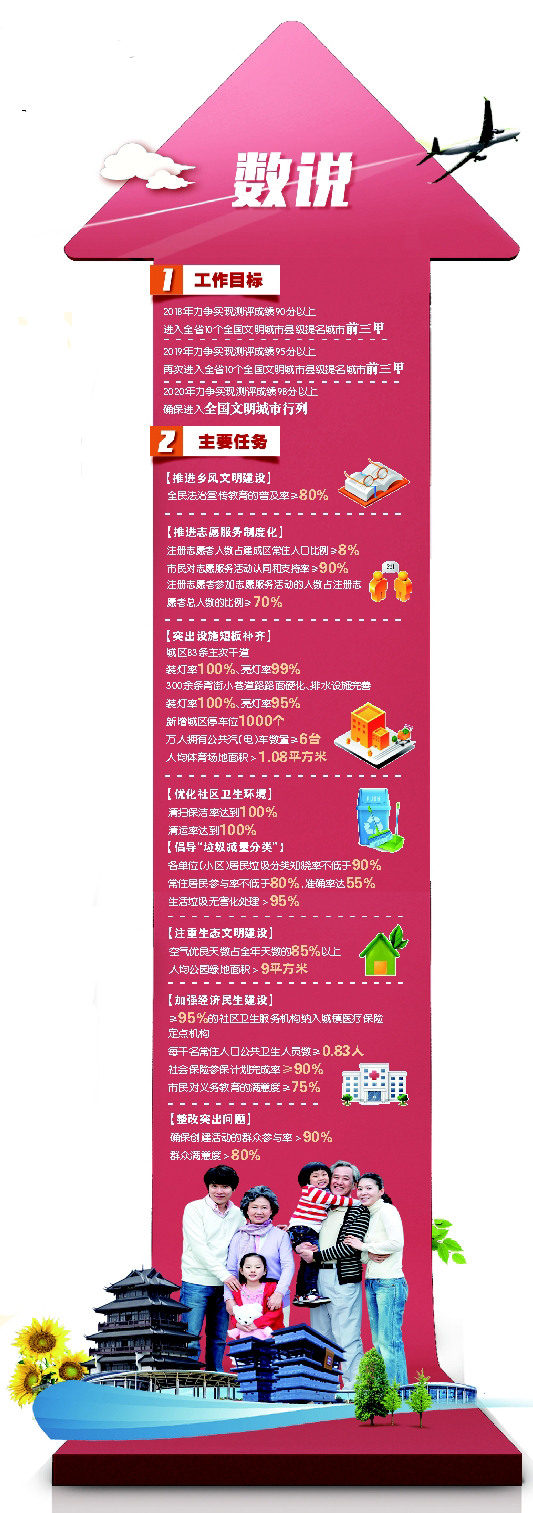 依据2017年度《全国县级文明城市测评体系》,按照“一年解难题、两年上台阶、三年保创成”的工作要求,突出2018年为“素质提升年”,2019年为“设施完善年”,2020年为“全面达标年”的主题年创建活动,高效有序推动市民文明素质不断提高、社会文明程度不断提升、城乡环境面貌不断改善、社会公共秩序不断优化,实现文明城市创建工作科学化、制度化、长效化,确保2020年我市进入全国文明城市行列。