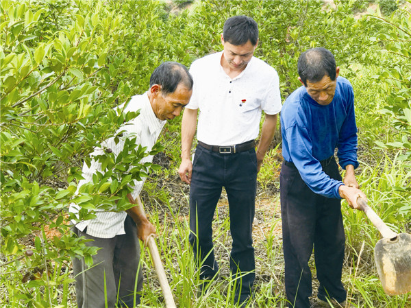 油茶合作社负责人姜小华(中)在油茶林基地现场作技术指导。