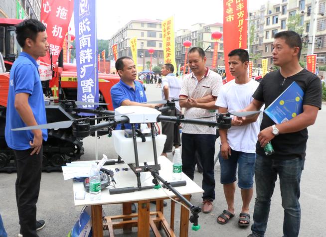 工作人员正在向农机大户们介绍植保机安全操作方法。