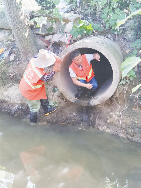 图为罗凯(右)正在查看民兵渠下游排污管。