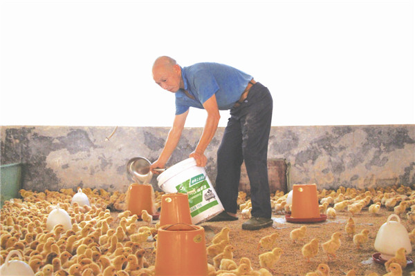双凫铺镇粟江村刘军华从贫困户摇身一变成了“养鸡王”。图为刘军华在给小鸡投料。(资料图片)